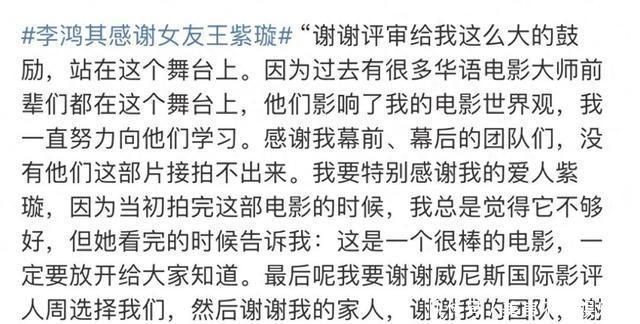 在此次电影节上,最让东说念主记取的可能不单是是李鸿其的导演新东说念主奖,而是他在获奖感言中对女演员王紫璇的尽头说起。